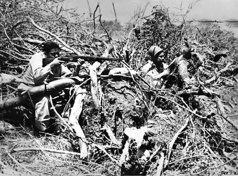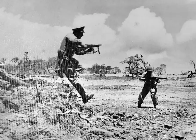 Los aviones atacantes son un AT-6 de gran velocidad y artillado con ametralladoras de 50 mm y un DC-3 al que se le habían quitado las puertas desde las que ametrallaban los miembros de la tripulación. Debajo de la espesura de los árboles las ametralladoras comenzaron a vomitar balas. Inmediatamente se contestó el fuego. El DC-3 fue derribado y precipitado al suelo. Tan pronto la columna empezó a contestar el fuego de las ametralladoras, empezaron a caer las granadas de los morteros enemigos en el macizo de árboles que había sido ocupado por la columna.