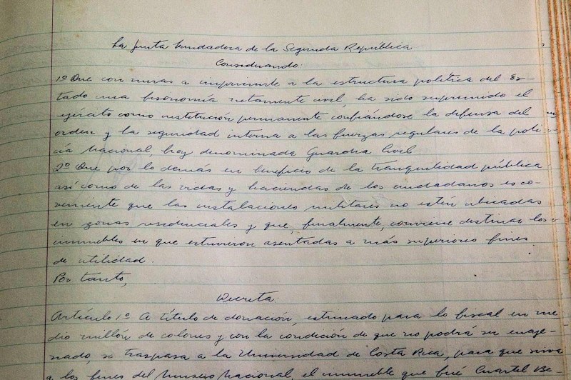 El documento de la Junta Fundadora de la Segunda República en que se elimina el ejército en Costa Rica. Se encuentra resguardado por el Archivo Nacional, en Zapote. Foto: Melissa Fernández. Melissa Fernández Silva