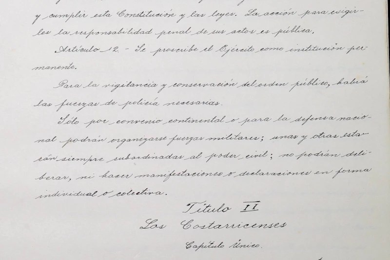 El artículo 12 de la Constitución Política de 1949 en que se proscribe el ejército. Foto: Melissa Fernández Silva. Melissa Fernandez Silva