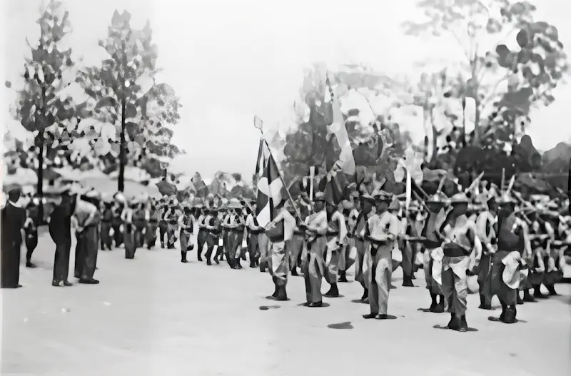 Los diferentes batallones, con su oficialidad al frente, abrían la marcha, comenzando con el Batallón El Empalme. Seguía el Alto Mando, y en su amplio automóvil, el Jefe del Ejército de Liberación Nacional, José Figueres, vistiendo su uniforme de kaki y puesta su típica cachucha revolucionaria. Saludaba a todo mundo, de pie en su vehículo, visiblemente emo­cionado y teniendo que estrechar las manos a cada paso, que le extendían las gentes, locas de entusiasmo. Las mujeres le lanzaban ramos de flores en el camino y alguna que otra, se había subido al estribo del automó­vil para besarlo sorpresivamente.
